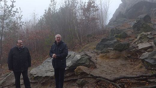 Wo bis vor kurzem Bäume und Sträucher die Sicht auf den markanten Großvaterfelsen an der Teufelsmauer verdeckt haben, tat es am 10. Dezember 2020 der Nebel. Aber das tat der Freude von Bürgermeister Heiko Breithaupt und Dr. Klaus George, Geschäftsstellenleiter beim Regionalverband Harz e.V., keinen Abbruch.