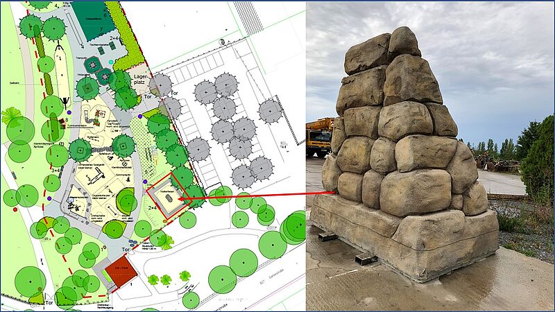 Umwelttechnik und Wasserbau GmbH. Die Mitarbeiter des Unternehmens haben mit der notwendigen Technik ausgeholfen und den drei Meter hohen und 2,5 Tonnen schweren Kletterfelsen abgeladen.