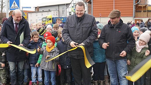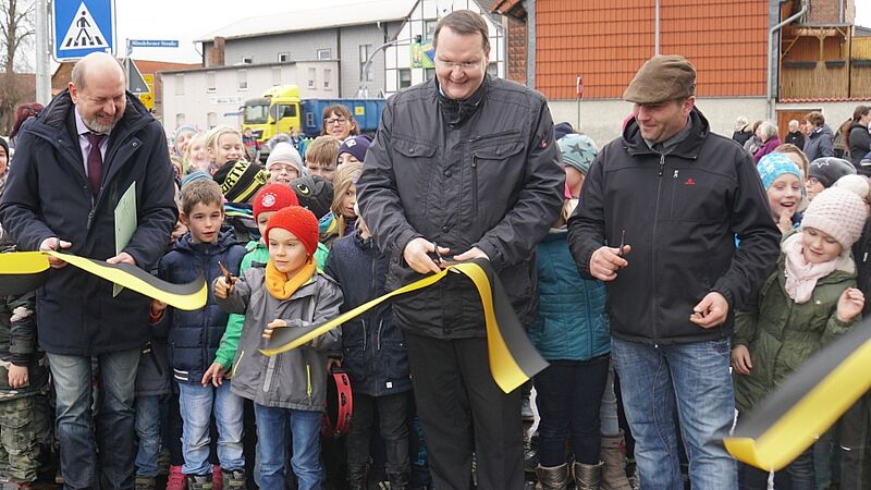 In besonderer Erinnerung wird der Tag für Schüler Aron Meyer bleiben. Im Namen der Schüler bedankte sich der Zweitklässler, dass der Wunsch nach einer neuen Straße und einem neuen sicheren Fußgängerüberweg erfüllt wurde. Im Anschluss durfte er gemeinsam mit Bürgermeister Heiko Breithaupt, Ortsbürgermeister André Salomon und Arno Manthey von der Landesstraßenbaubehörde den symbolischen Scherenschnitt vornehmen.