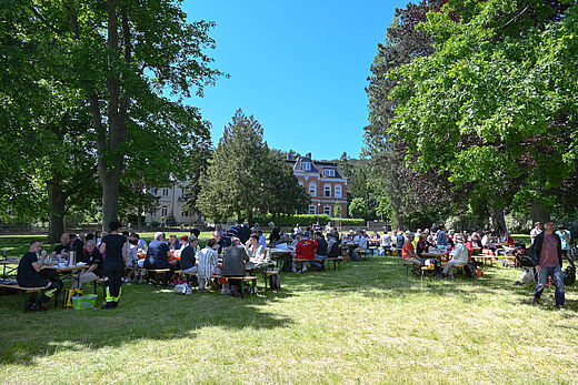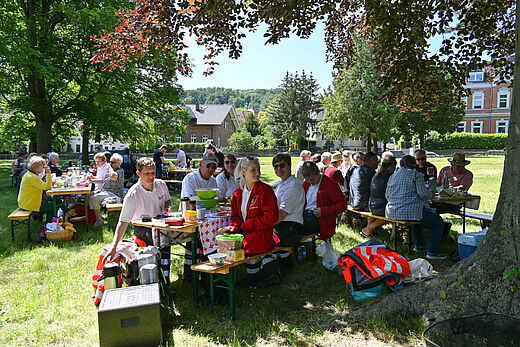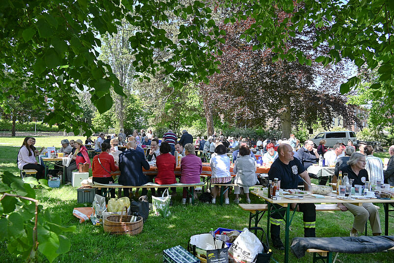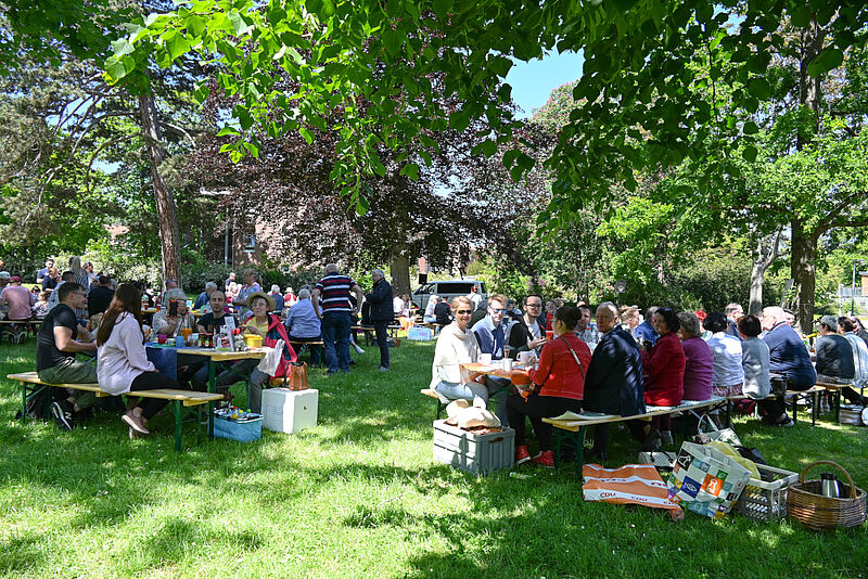 20 Bierzeltgarnituren wurden von den unterschiedlichsten Teilnehmenden gebucht. So fanden sich Vereine, Parteien, Freundeskreise, Sportgemeinschaften, Familien, Arbeitskollegen und Initiativen am Sonntagvormittag um 11 Uhr in der historischen Parkanlage unter dem schattenspendenden, altehrwürdigen Baumbestand ein, um gemeinsam ein paar schöne Stunden zu verbringen.