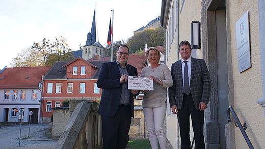 < bBürgermeister Heiko Breithaupt erhält Spendenscheck der ÖSA-Versicherung