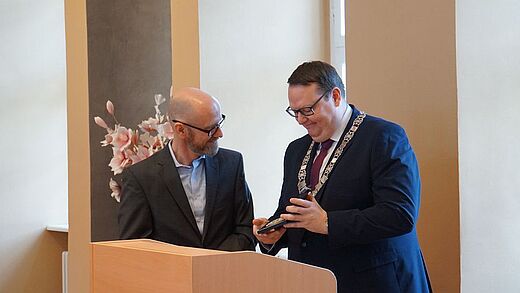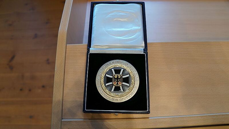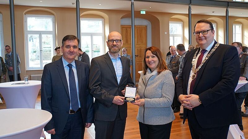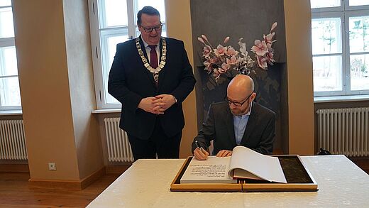 Vor der offiziellen Eröffnung bat der Bürgermeister, Dr. Peter Tauber um einen Eintrag in das Ehrenbuch der Stadt. Dieser bedankte sich für diese Anerkennung und überreichte dem Bürgermeister anlässlich seines Besuches in der Blütenstadt, die Medaille der Bundesministerin für Verteidigung.