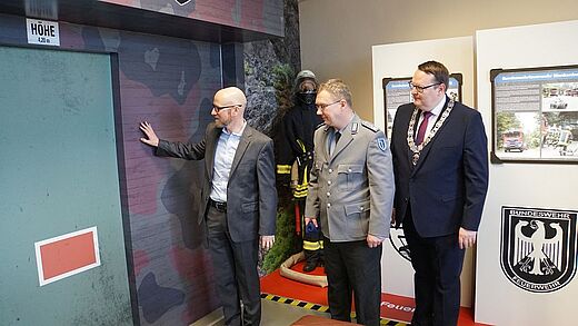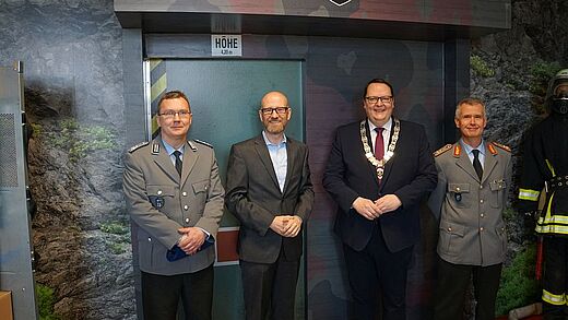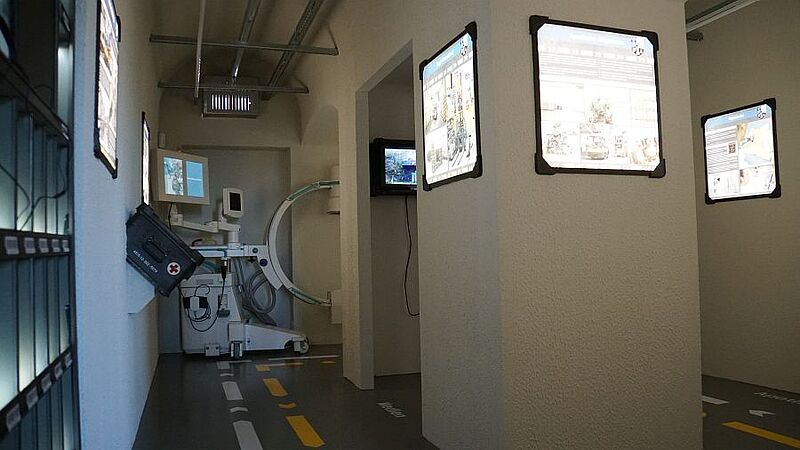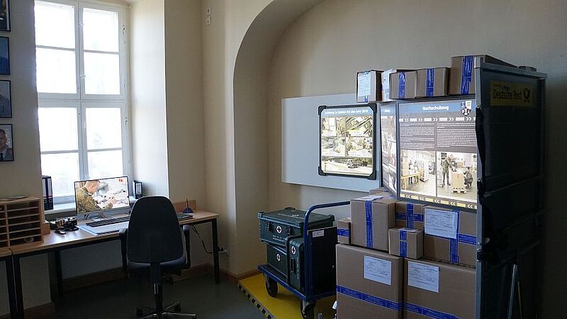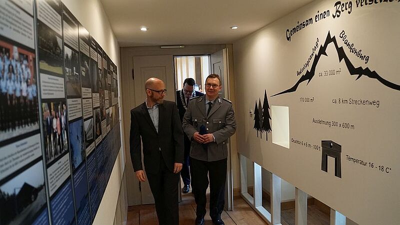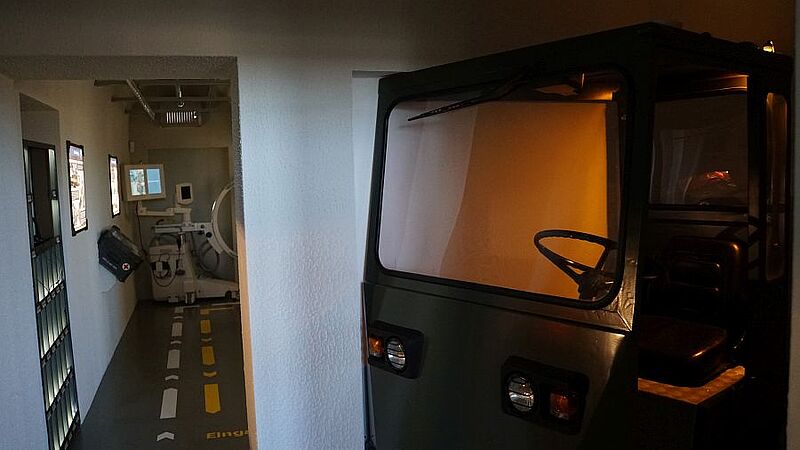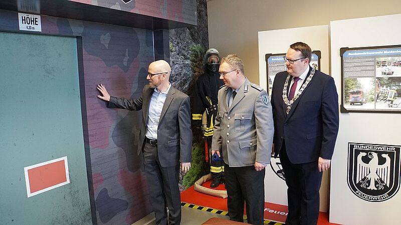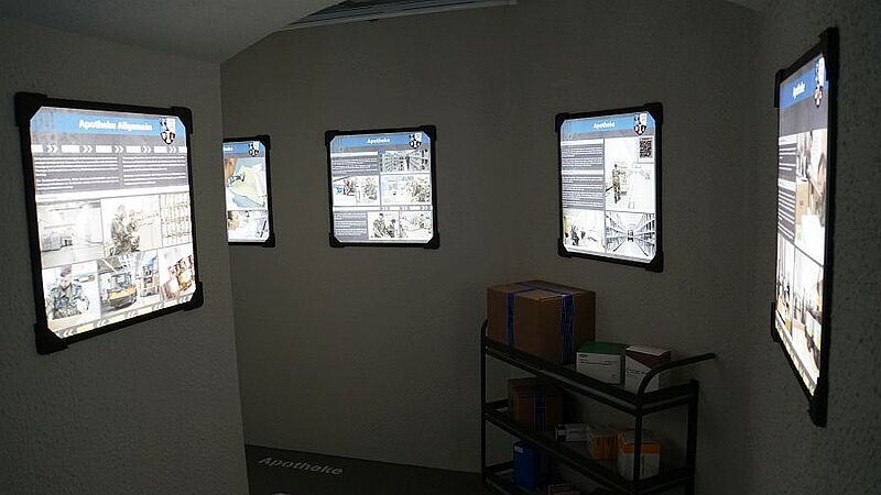 Anschließend besichtigten sie, gemeinsam mit Oberfeldapotheker Marco Haupt, die Ausstellung, deren Vorbereitung zwei Jahre gedauert hat. Besucher können unter anderem auf einer virtuellen Jeep-Tour mittels VR-Brille, die unterirdischen Lager erkunden. In zahlreichen Videos, Tonaufnahmen und Schautafeln wird die tägliche Arbeit in der Feldwebel-Anton-Schmid-Kaserne anschaulich dargestellt.