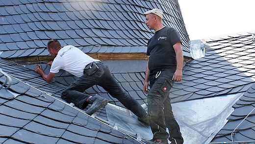 Bauleiter Sven Ungetüm konnte eindrucksvolle Zahlen vorzeigen: 4.500m² Dachfläche wurden in den letzten 10 Jahren saniert und mit Schiefer gedeckt. Dabei wurden unter anderem 500m³ Holz verbaut und 1.000 Container Bauschutt entsorgt.