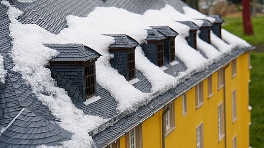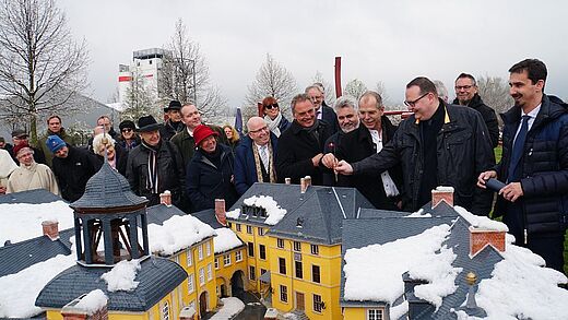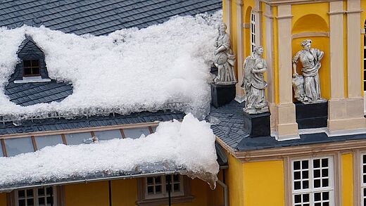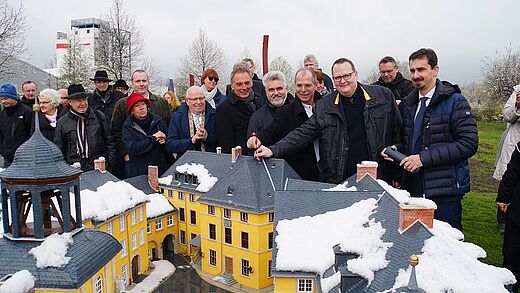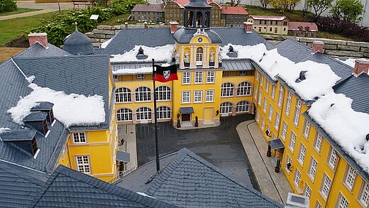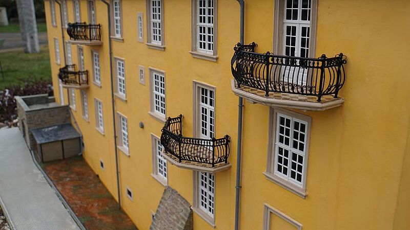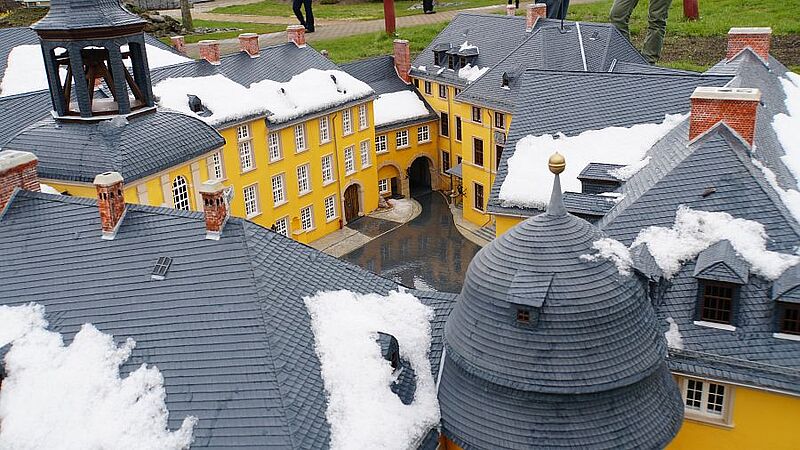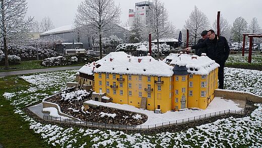Insgesamt haben 18 Mitarbeiter über einen Zeitraum von vier Jahren an dem imposanten Modell gearbeitet. Alle Gebäudeelemente wie Mauersteine, Dachziegel, Fenster, Dachrinnen oder kleinste Figuren wurden mit viel Liebe zum Detail in Handarbeit gefertigt. Dabei haben die Erbauer eine kleine Zeitreise in die Zukunft unternommen und haben das Große Schloss in fertig saniertem Zustand dargestellt.