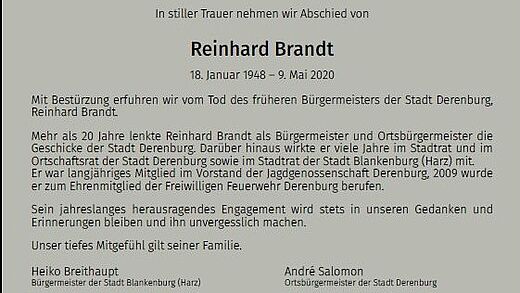 Derenburgs ehemaliger Bürgermeister Reinhard Brandt verstarb am 9. Mai 2020 im Alter von 72 Jahren. Mehr als 20 Jahre lang lenkte er die Geschicke der Stadt in verschiedenen Tätigkeiten.