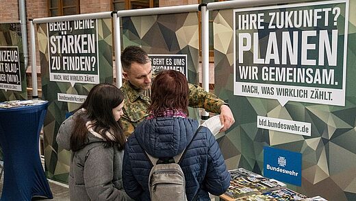 Die Bundeswehr war ebenfalls vor Ort und informierte über Karrierechancen „bei der Truppe“. Beratungsstände der Arbeitsagentur, der Kommunalen Beschäftigungsagentur oder von Pflegeinrichtungen und Schulen vervollständigten das Angebot, und ließen die dritte Ausgabe der BBOM zu einem Erfolg werden.