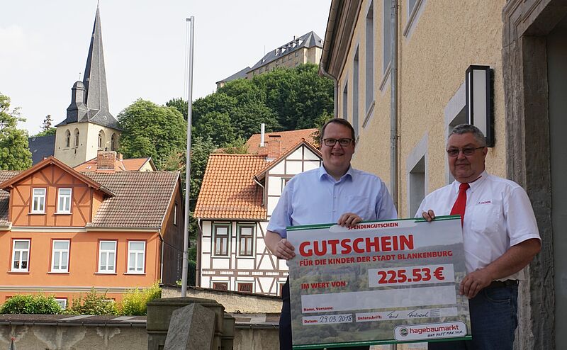 Einen Spendencheck erhielt die Stadt Blankenburg (Harz) am Dienstag, den 29.5.2018 von Fred Fränzel, Leiter des Hagebaumarktes in der Lerchenbreite. Der Betrag stammt aus dem Bonusprogramm des Marktes. Dieser wurde noch einmal aufgestockt, so dass die Stadt sich über die Summe von 382,74 Euro freuen kann. Auf Wunsch von Herrn Fränzel soll das Geld den Kindern der Stadt zugutekommen, weshalb es in die Erneuerung des Spielplatzes im Wohngebiet Regenstein fließt. "Wir sagen im Namen der Kinder unserer Stadt ein Herzliches Dankeschön an den Hagebaumarkt und Herrn Fränzel“, freut sich Bürgermeister Heiko Breithaupt.