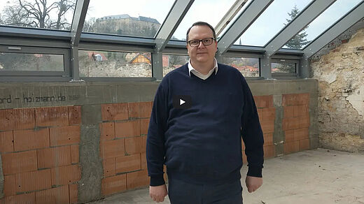 Bürgermeister Heiko Breithaupt meldet sich aus der Orangerie im Kleinen Schloss und Gastronom Andreas Werner informiert zum Fortschritt im Panorama-Saal der Burg und Festung Regenstein.