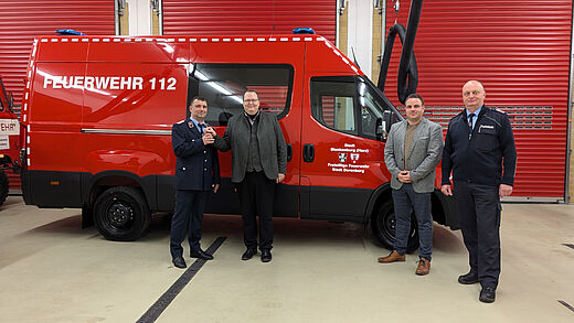 Derenburgs Ortswehrleiter René Selle nahm den Schlüssel des nagelneuen Mehrzweckfahrzeuges von Blankenburgs Bürgermeister Heiko Breithaupt entgegen. Stadtwehrleiter Werner Greif und Dr. Alexander Beck, der als stellvertretender Stadtwehrleiter bei der technischen Ausstattung des MFZ unterstützte, gratulierten und wünschten allzeit gute Fahrt. Foto: Jana Böhme