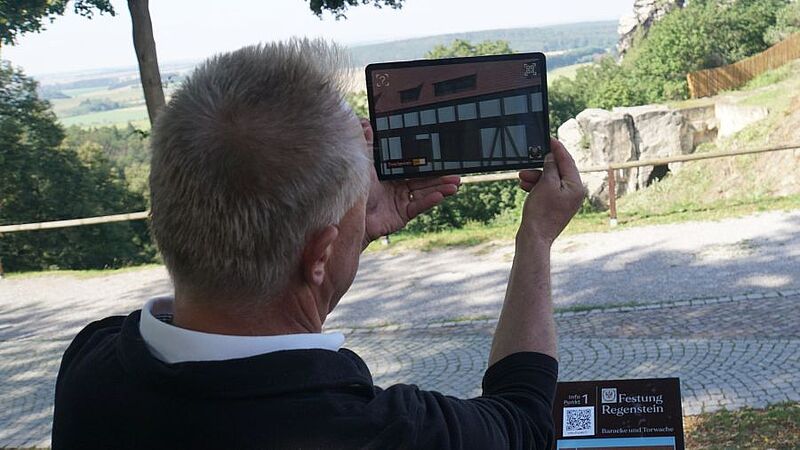 Um die Burganlage digital erleben zu können muss zuvor die „Regenstein AR“, die sowohl für Android als auch iOS verfügbar ist, installiert werden. Die Apps sind hier zu finden: www.denkmal.arctron.de/festung-regenstein/app/