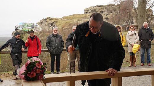 Am Freitag wurde Richtfest für das neue Servicegebäude auf der Burg und Festung Regenstein begangen. Nachdem Zimmermann André Müller den traditionellen Richtspruch vorgetragen hatte, war es die gemeinsame Aufgabe von Bürgermeister Heiko Breithaupt und BTB-Leiterin Dagmar Kamp, den letzten Nagel in das Gebälk zu schlagen.