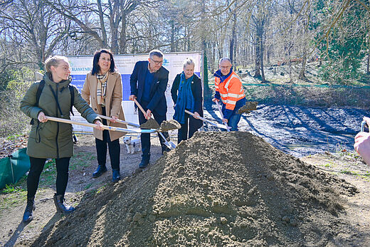 Symbolischer Spatenstich zur Sanierung des Schlossteiches (v.l.n.r.): Linn Olden vom kommunalen Grünflächenmanagement, Blankenburgs stellvertretende Bürgermeisterin Madeleine Bürger, Stadtratsvorsitzender Klaus Dumeier, Katrin Schube von der BauBeCon Sanierungsträger GmbH und Bernd Haberla, Leiter der Blankenburger Niederlassung der Pabsch Ingenieure GmbH. Foto: Jana Böhme