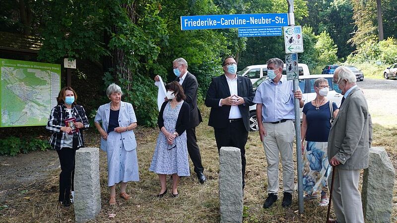 „Straßennamen erzählen Stadtgeschichte“, ganz in diesem Sinn hat Sachsen-Anhalts Staatsminister Rainer Robra am 12. August 2021 in Blankenburg das Schild für die neu benannte „Friederike-Caroline-Neuber Straße“ enthüllt. Auf Initiative des „Vereins zur Förderung der Friederike-Caroline-Neuber-Stiftung (Neuberin-Stiftung) Blankenburg e. V.“, hatte der Blankenburger Stadtrat im Jahr 2020 beschlossen, ein Teilstück des Herzogweges, zwischen Schieferberg und Marstall, umzubenennen. Eine Infotafel, die ebenfalls enthüllt wurde gibt umfangreiche Auskünfte über das Wirken der Neuberin in der Blütenstadt.