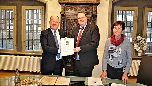Auf dem Bild: v.l. Minister Thomas Webel, Bürgermeister Heiko Breithaupt und Stadtratsvorsitzende Birgit Kayser