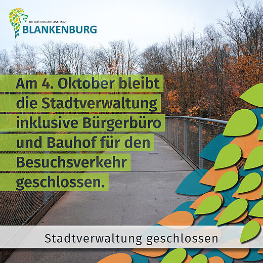 Am Freitag, den 04.10.2024, bleibt die gesamte Kernverwaltung inklusive Bürgerbüro und Bauhof für den Besuchsverkehr geschlossen.