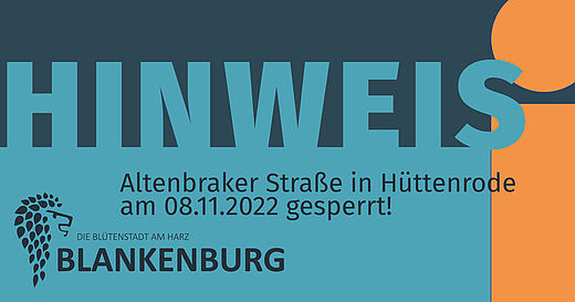 Im Blankenburger Ortsteil Hüttenrode wird am Dienstag, den 8. November 2022, die Altenbraker Straße zwischen der Einmündung von der Bundesstraße 27 und der Kampstraße in der Zeit von 8.00 bis voraussichtlich 17.00 Uhr voll gesperrt.