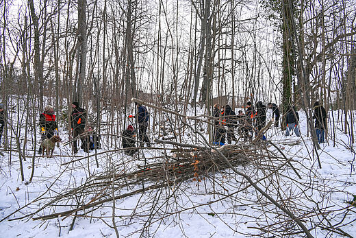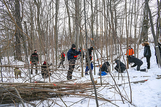 Unter der fachkundigen Anleitung der Mitarbeitenden des Jugendwaldheims, das von Jascha Ückert geleitet wird, erlernten die Schülerinnen und Schüler den sicheren Umgang mit Astsägen und wurden in die Grundlagen des korrekten Baumschnitts eingeführt. Danach ging es an die Praxis: Im verschneiten Schlosspark hinter dem Damwildgehege befreiten sie ausgewählte Flächen von dichtem Bewuchs.