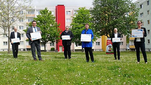 Thomas Kempf, Geschäftsführer der Blankenburger Wohnungsgesellschaft, Tim Schlenkermann, Geschäftsführer der Stadtwerke Blankenburg, sowie Blankenburgs Bürgermeister Heiko Breithaupt nahmen die Urkunden entgegen.