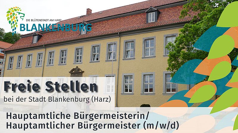 In der Stadt Blankenburg (Harz) ist die Stelle der/des hauptamtlichen Bürgermeisterin/Bürgermeisters (m/w/d) durch Ablauf der Amtszeit ab dem 07.07.2022 im Wege der Direktwahl neu zu besetzen.