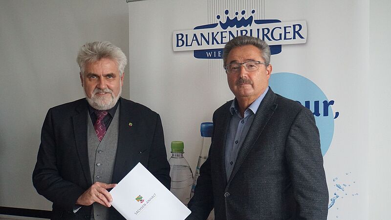 Qualität, Regionalität und Tradition – mit diesem Erfolgsrezept befindet sich die Harzer Mineralquelle Blankenburg GmbH seit der Wiedervereinigung kontinuierlich auf einem erfolgreichen Wachstumskurs. Allein zwischen 1998 und 2020 konnte das Unternehmen die Zahl der Flaschenfüllungen von 16 auf 95 Millionen steigern. Seinen Wachstumskurs will die Harzer Mineralquelle in den kommenden Jahren fortsetzen und zugleich Energie und Treibhausgasemissionen einsparen. Das Unternehmen investiert deshalb rund zwei Millionen Euro in moderne Produktionstechnik. Das Wirtschaftsministerium unterstützt die Investition des Unternehmens mit 820.000 Euro aus der Gemeinschaftsaufgabe „Verbesserung der regionalen Wirtschaftsstruktur“. Sachsen-Anhalts Wirtschaftsminister Prof. Dr. Armin Willingmann übergab dazu am Montag bei seinem Besuch am Unternehmensstandort einen Zuwendungsbescheid an Ralph Weitemeyer, Geschäftsführer der Harzer Mineralquelle Blankenburg GmbH.