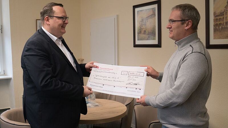 Einen symbolischen Scheck in Höhe von 4 480 Euro, zugunsten der Opfer der Explosionskatastrophe vom 13. Dezember 2019, hat Michael Lüders an Bürgermeister Heiko Breithaupt übergeben. Die Summe kam bei der Benefizveranstaltung, die am 28. Dezember 2019 im <link https: www.ewerk-blankenburg.de _blank external-link-new-window>Alten E-Werk stattfand, zusammen.