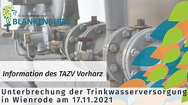 Information des TAZV Vorharz Sehr geehrte Kundinnen und Kunden,aufgrund von Rohrnetzarbeiten durch unseren Vorlieferanten, der Fernwasserversorgung Elbaue-Ostharz GmbH, wird am Mittwoch, den 17.11.2021, von 13:00 Uhr bis ca. 17:00 Uhrdie Trinkwasserversorgung in der Ortschaft Wienrode unterbrochen.Von der genannten Maßnahme sind alle Haushalte und Gewerbetreibenden im gesamtenOrt betroffen! Wir bitten Sie, sich mit ausreichend Trinkwasser zu bevorraten.Vielen Dank für Ihr Verständnis!