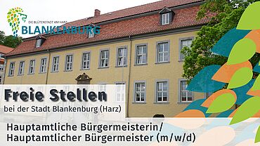 In der Stadt Blankenburg (Harz) ist die Stelle der/des hauptamtlichen Bürgermeisterin/Bürgermeisters (m/w/d) durch Ablauf der Amtszeit ab dem 07.07.2022 im Wege der Direktwahl neu zu besetzen. Zur Stellenausschreibung