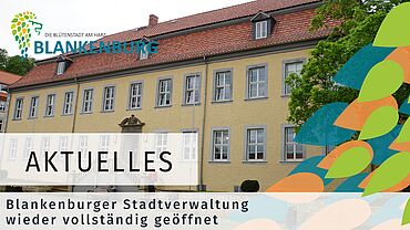 Ab Montag, 12. Juli 2021, sind die Fachbereiche der Verwaltung der Stadt Blankenburg (Harz) wieder für alle Bürgerinnen und Bürger vollständig geöffnet. Damit können die Blankenburgerinnen und Blankenburger sowie die Einwohner in den Ortsteilen wieder persönlich in das städtische Rathaus kommen. Montags, dienstags, donnerstags und freitags 9:00 – 12:00 Uhr sowie dienstags 15:00 – 18:00 Uhr und donnerstags 14:00 – 16:00 Uhr sind die Mitarbeiterinnen und Mitarbeiter der Stadt Blankenburg (Harz)...