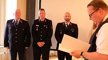 Im würdigen Rahmen der Sitzung des Blankenburger Stadtrates, am 3. Juni 2021, hat Bürgermeister Heiko Breithaupt (r.) Jörg Hohmann (l.) für weitere sechs Jahre zum Wehrleiter der Freiwilligen Feuerwehr Hüttenrode ernannt. In Wienrode werden künftig Wehrleiter Tobias Droste (2.v.l.) und sein Stellvertreter Richard Rietenbach die Geschicke der Freiwilligen Feuerwehr leiten. Gemeinsam mit Fachbereichsleiterin Laura Röhl hat das Stadtoberhaupt den drei Feuerwehrmännern die Ernennungsurkunde zum...