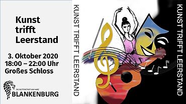 Am Samstag, den 03.10.2020, findet zum zweiten Mal die Aktion "Kunst trifft Leerstand“ in Blankenburg (Harz) statt.Die Organisatoren haben für die Zeit von 18 – 22 Uhr ein buntes wiederholendes Programm vorbereitet. Künstler, Tänzer, Musiker und Darsteller zeigen auf dem Großen Schloss einen bunten Mix aus Tanz, handgemachter Musik, Theater, Kino und Lichtkunst.Darbietungen auf acht verschiedenen Bühnen verwandeln das Schloss in eine bunte und belebte Welt. Der Eintritt kostet 3 Euro....
