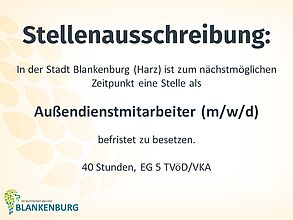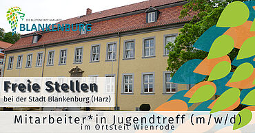 Bei der Stadt Blankenburg (Harz) ist zum nächstmöglichen Termin die Stelle Mitarbeiter/in Jugendtreff (m/w/d) im Ortsteil Wienrode zu besetzen. Die regelmäßige wöchentliche Arbeitszeit beträgt 15 Stunden.
