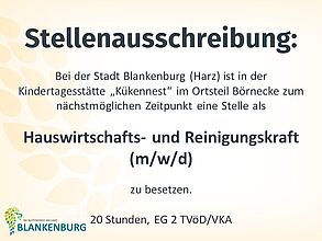Bei der Stadt Blankenburg (Harz) ist in der Kindertagesstätte „Kükennest“ im Ortsteil Börnecke zum nächstmöglichen Zeitpunkt eine Stelle als Hauswirtschafts- und Reinigungskraft (m/w/d) zu besetzen. Die durchschnittliche regelmäßige wöchentliche Arbeitszeit beträgt 20 Stunden und richtet sich nach dem Dienstplan der Kindertagesstätte. Das Beschäftigungsverhältnis richtet sich nach den Bestimmungen des Tarifvertrages für den öffentlichen Dienst (TVöD). Die Stelle ist mit der Entgeltgruppe 2...