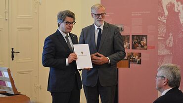 Dr. Christian Philipsen, Generaldirektor der Kulturstiftung Sachsen-Anhalt, durfte aus den Händen von Staatsminister Rainer Robra einen Förderbescheid in Höhe von exakt 3 118 664,94 Euro entgegen nehmen. Die Mittel stammen aus dem Europäischen Fonds für regionale Entwicklung (EFRE) und sollen im Kloster Michaelstein für die Neugestaltung des Wirtschaftshofes - der großen Freifläche zwischen Musikscheune, Gästehaus, der Alten Schmiede und dem Pavillon der Musikmaschine verwendet werden. Wie...