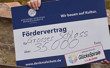 Andre Gast, ehrenamtlicher Geschäftsführer der gemeinnützigen Schloss GmbH erhielt aus den Händen von Claus Mangels, Ortskurator Magdeburg der Deutschen Stiftung Denkmalschutz (DSD), einen symbolischen Fördervertrag über 35.000 Euro. „Mit besten Grüßen von Lotto Toto“ ergänzte Claus Mangels. Der staatliche Anbieter von Lotterien und Sportwetten unterstützt die Sanierungsarbeiten mit weiteren 45.000 Euro. Laut Andre Gast soll die Summe für die Sanierung des Daches des Verwalterhauses am Großen...