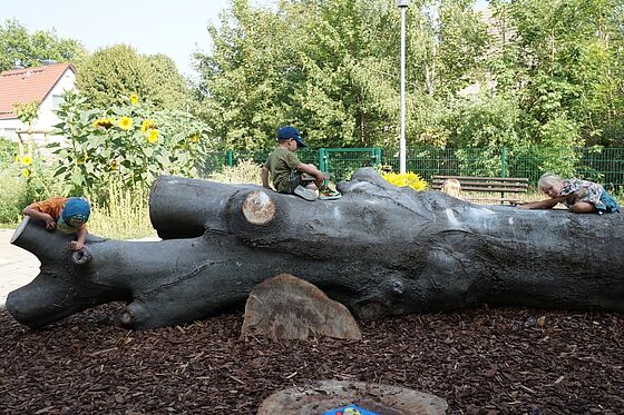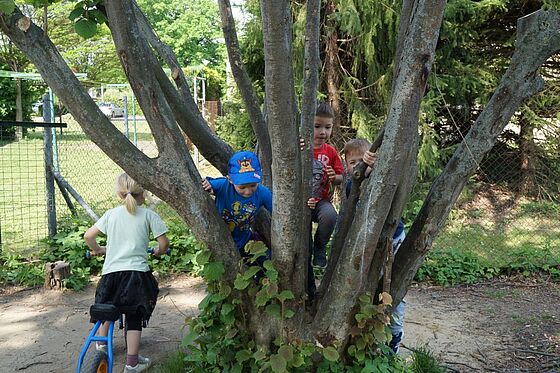 Wir haben einen naturnahen Garten. Abenteuer, Erlebnis, Beobachtung der Natur stehen bei uns im Vordergrund. Es ist strengstens erlaubt in Büschen zu spielen, auf Bäumen zu klettern, zu Matschen, in Pfützen zu springen, mit Steinen und Stöcken zu spielen, kurz sich mit der Natur zu vereinen.