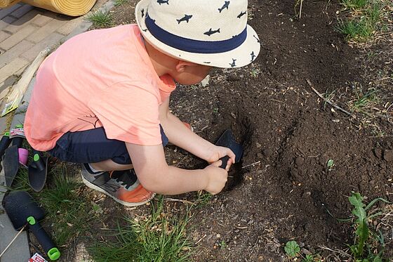Durch das Gewächshaus haben die Kinder die Möglichkeit, vom Samen bis zur Ernte das Gärtnern zu erlernen. Auch gibt es Naschhecken mit verschiedenen Beeren, die allen Kindern und Eltern zur Verfügung stehen. Wir nutzen Regentonnen für Gießwasser, Kompost und ein Bokashi-System.