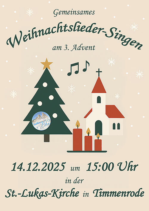 Die Chorgemeinschaft „Teufelsmauer Echo“, die kleinen und großen Gitarrenspieler der Kirchgemeinde Wienrode sowie die „Kirchzwerge“ aus Timmenrode laden wieder herzlich zum gemeinsamen Weihnachtsliedersingen am 3. Advent in die Kirche Timmenrode ein.