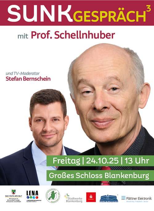 Die Veranstaltung findet am Freitag, 24. Oktober, ab 13 Uhr im Großen Schloss Blankenburg statt. Der Eintritt ist kostenfrei. Die SUNK lädt ausdrücklich zum Mitreden ein: Fragen aus dem Publikum sind erwünscht. Die kostenfreien Tickets sind online verfügbar unter www.pretix.eu/sunk/schellnhuber .