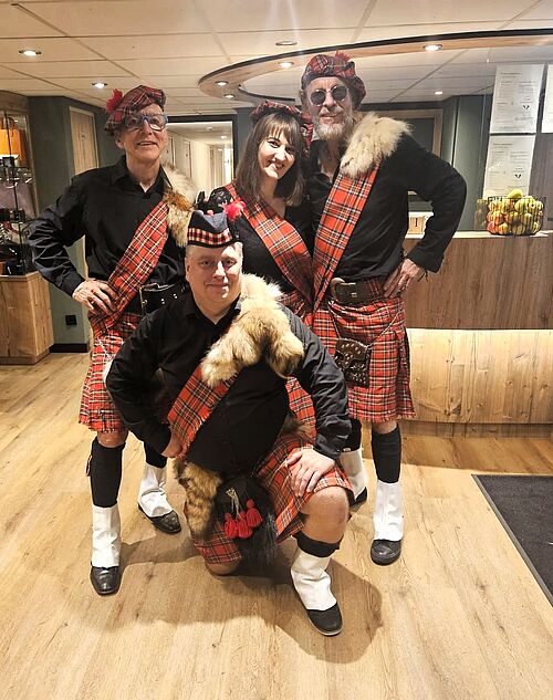 Da stimmen die traditionellen Farben der Kleidung, der Dudelsack steht im musikalischen Mittelpunkt und wer wollte nicht schon immer wissen was verbirgt sich denn unterm Schottenrock. Gespielt wird also in schottischen Trachten und keltische Musik, in gekonnter Mischung mit Country, Pop, Rock im eigenen Stil der Besetzung.