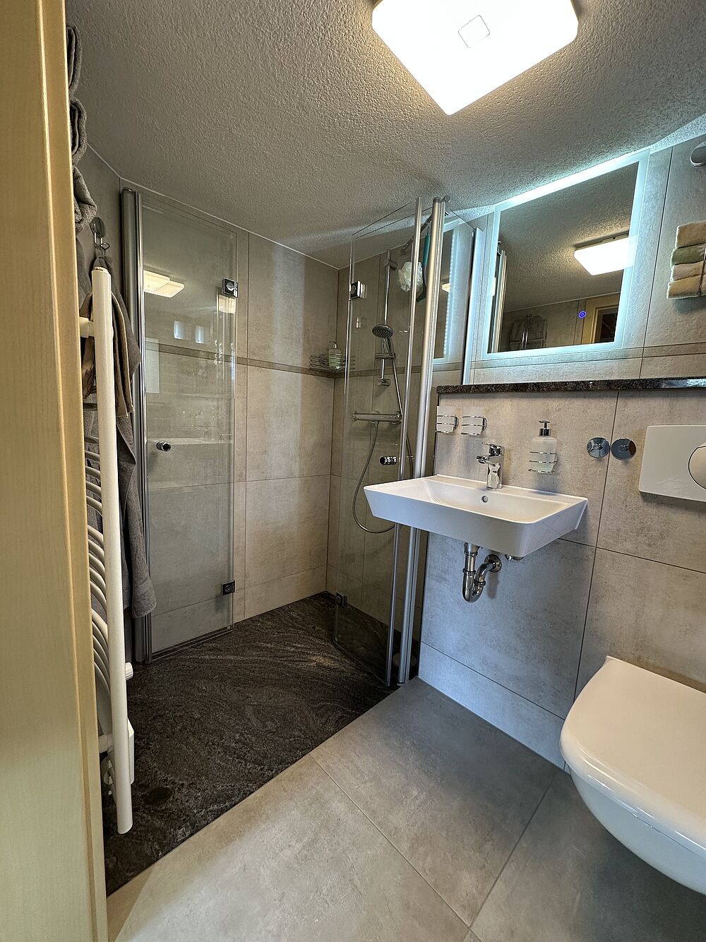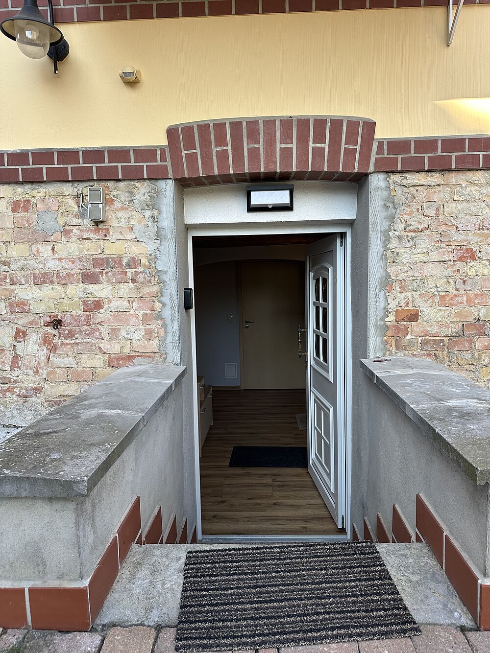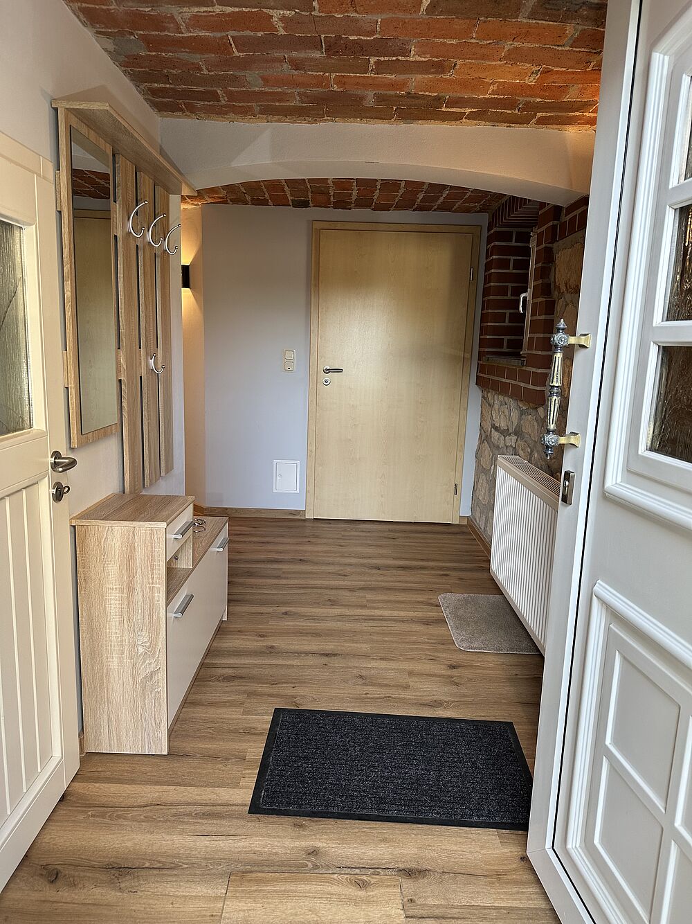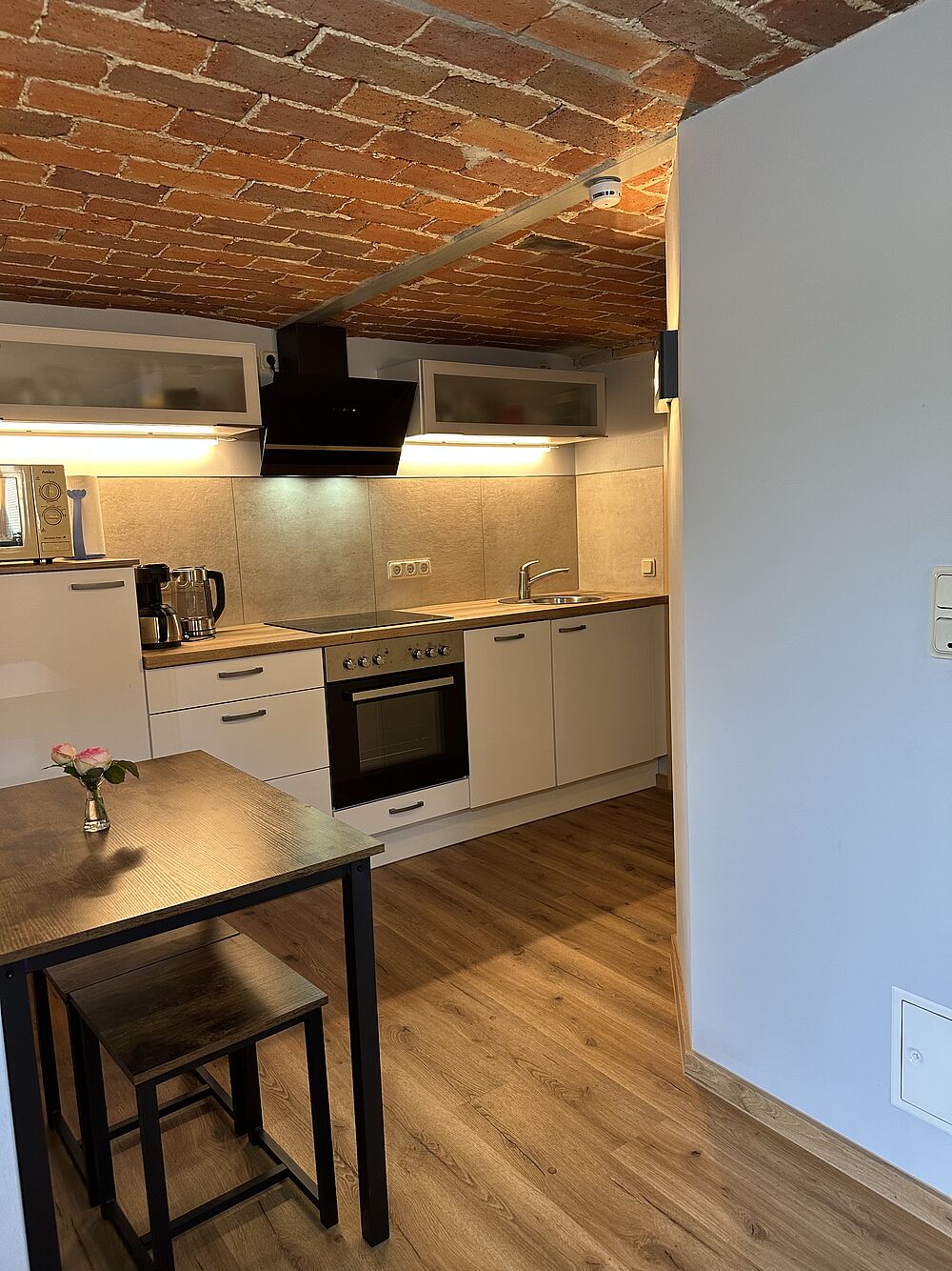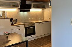 Diese Ferienwohnung besteht aus ein Schlaf-/ Wohnraum. Ein separater Eingang führt zum Flur mit voll ausgestatteter Küche, sowie zu einem Badezimmer mit einer Dusche, WC, Waschbecken und Handtuchtrockner.